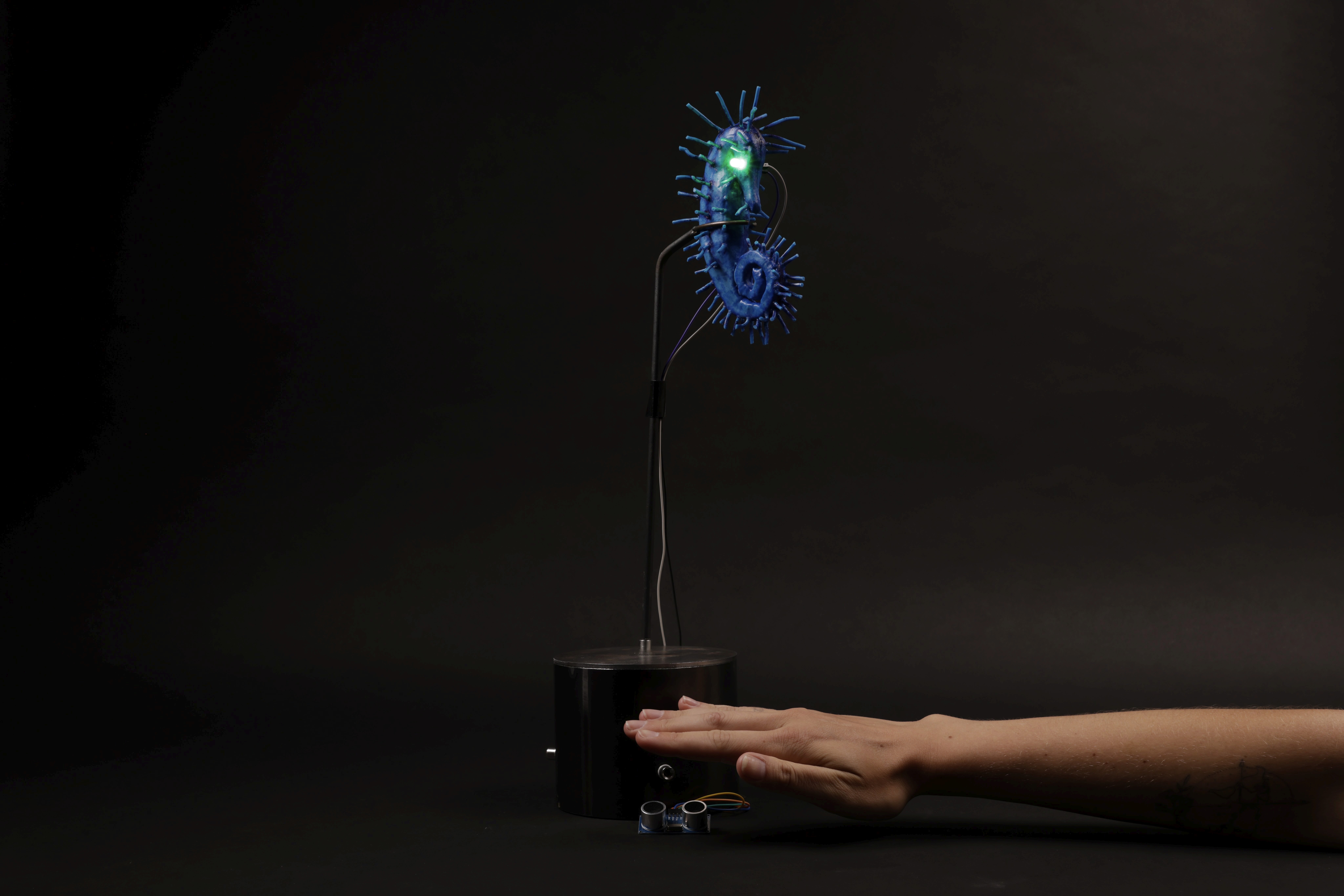 The cyborg seahorse artefact acts as a solitary device, as well as a character in the film, and helps imagine a world in which cybernetic organisms are used as an extension of surveillance networks - camouflaging and immersing themselves amongst communities and environments. Built through a process both hand-crafted and digital, using organic and synthetic materials, this cyborg is equipped with LED eyes that light up after sensing movement nearby.