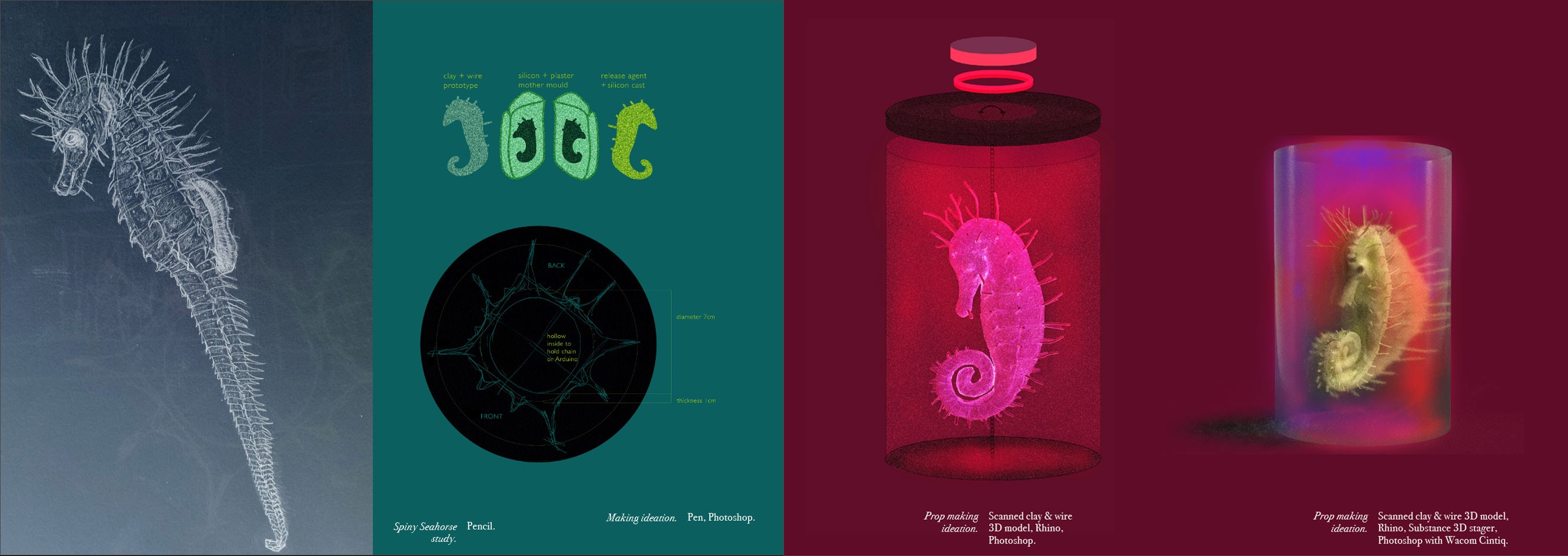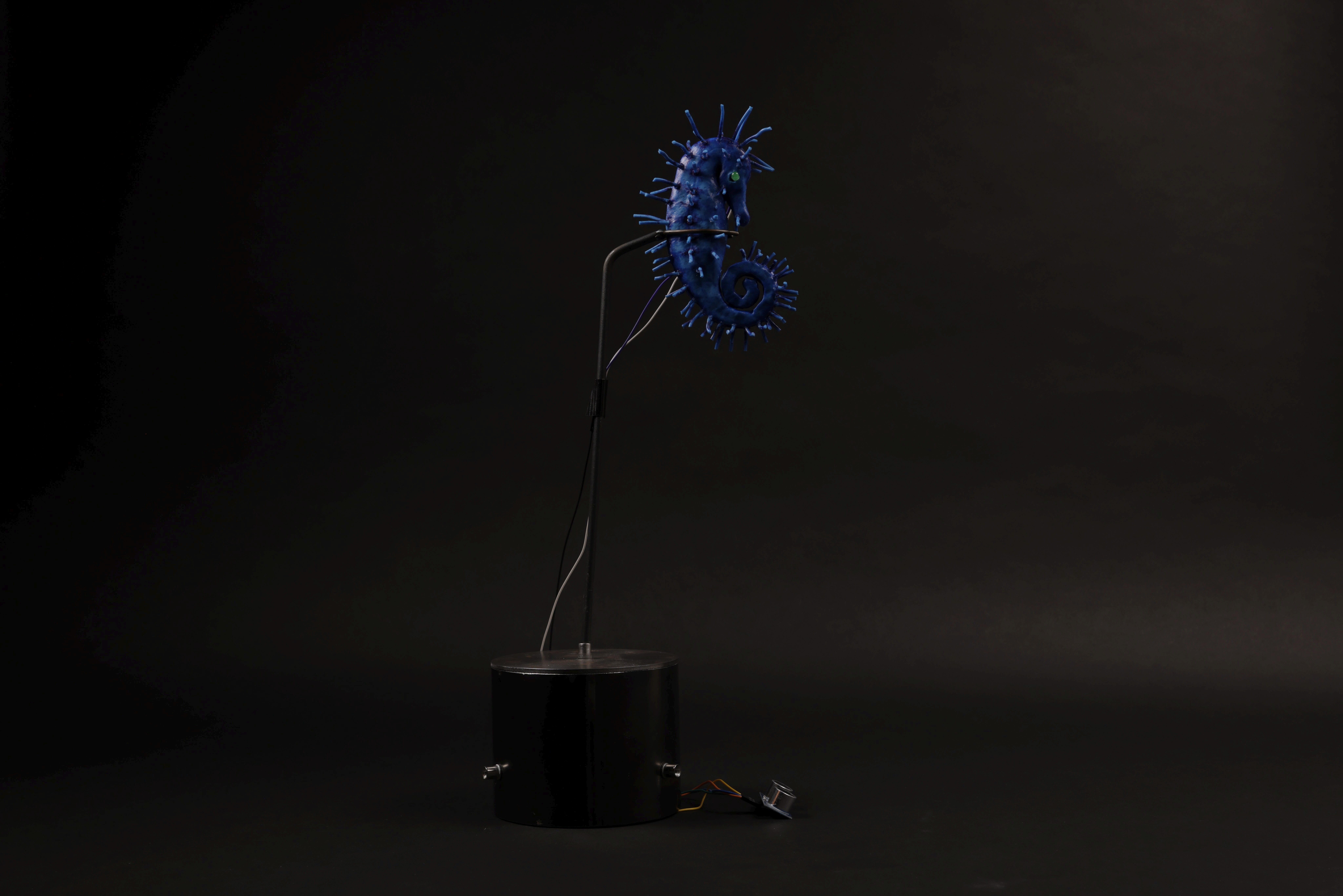 Silicon cyborg seahorses: Clay and wire model > 3D scanned > inverse Rhino > 3D printed > silicon cast in mould > silicon thread pinning > Arduino programming via Chat GPT/DeepSeek for microcontroller, sensor + LEDs.