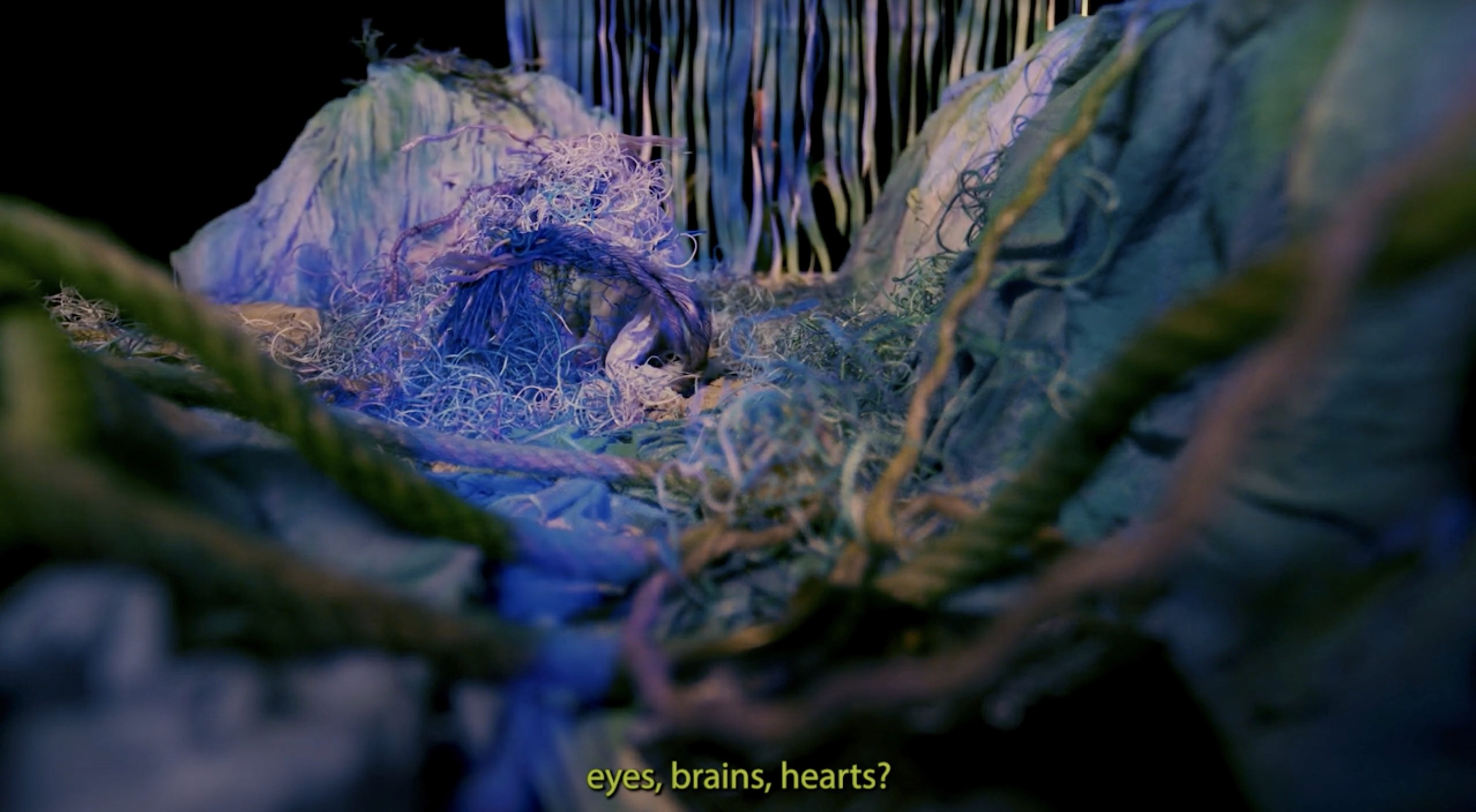 Underwater Shannon river estuary set: Re-used, discarded materials, dyed, cut and painted fabrics and natural fibres, aluminium mesh, rotating steel 'seaweed tree' fabrication.