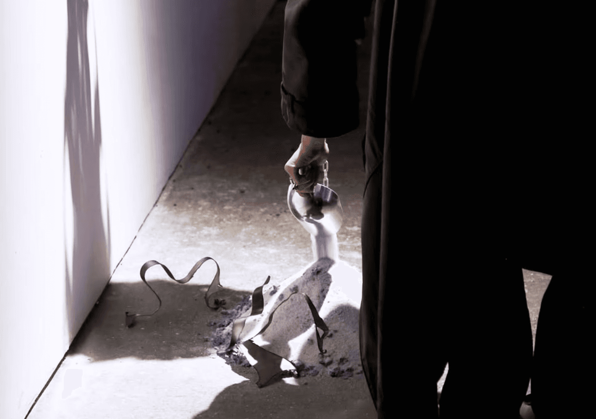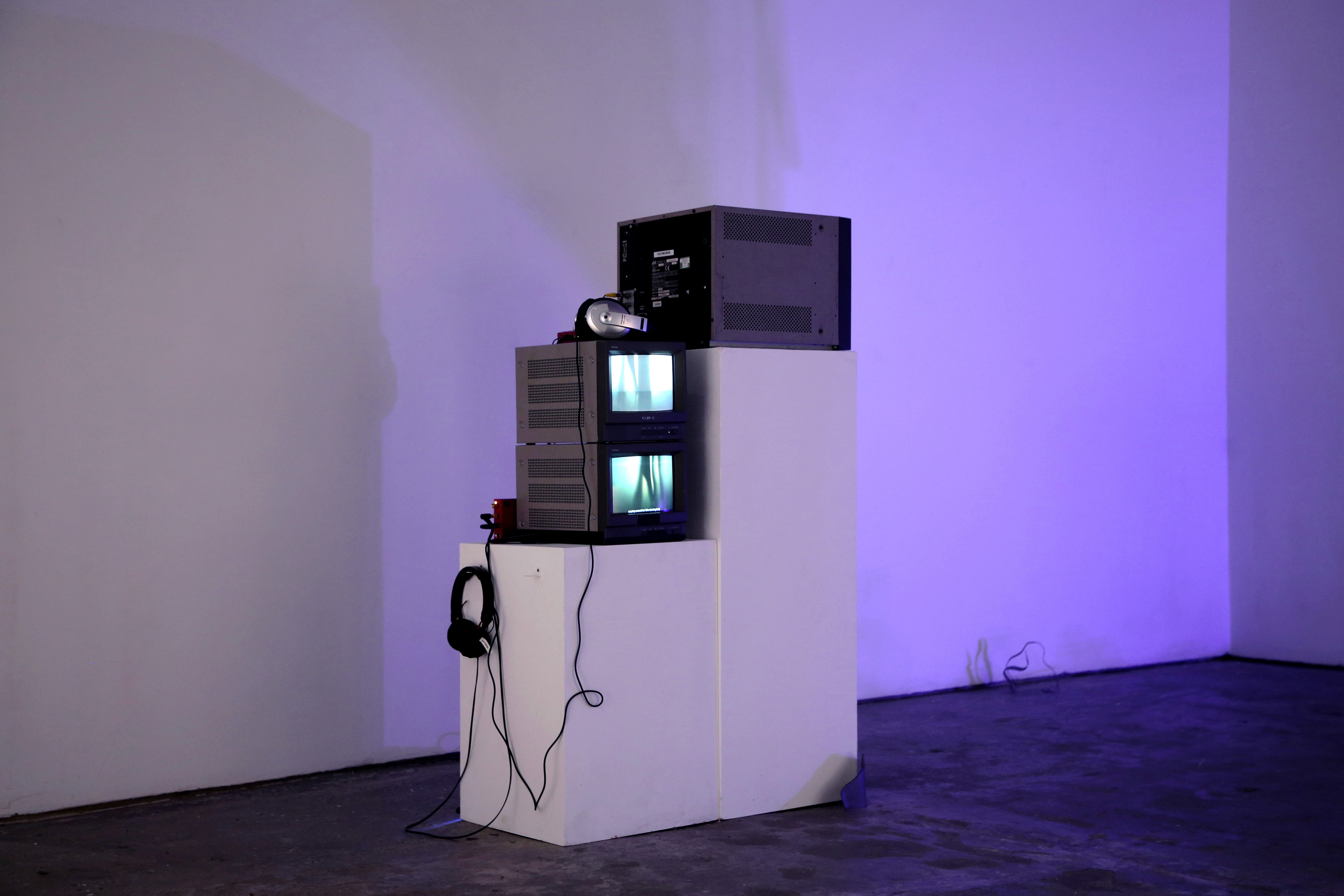 Three separate pieces of work were combined amongst a space flooded in cold and purple lights, strewn with discarded scrap metals - a hanging sculptural piece, 'I Float, For As Long As I Can', an then two films shown on old VCR screens, 'Tendrils', and 'Here Lie Our Bodily Relics'.